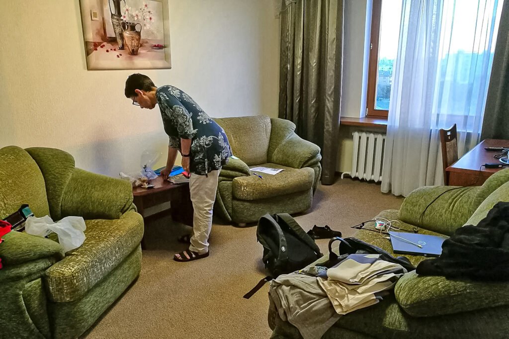 מינסק נמצאת 3 וחצי שעות טיסה מישראל, ויש שם 3 וחצי אנשים שיודעים אנגלית. לא לדאוג, אני יודעת 3 וחצי מילים ברוסית, ובבית נשאר בן זוג אוזבקי שבמידה והיה אינטרנט זמין שימש כמתרגם. כצפוי, 99% מהאנשים איתנו בטיסה דוברי רוסית, כולל 3 מתעמלים ואחד מאמן. טיסת הצהריים שלנו היית אמורה לנחות ב-15:30 במינסק, ולפי התכנון שלנו אנחנו מגיעות בדיוק בזמן לגמרים בג'ודו (מתחילים ב-17:00) לאותו יום ומחזיקות אצבעות שלי קוכמן יהיה שם. אז לי קוכמן אכן מפתיע את כולם ועולה לגמר, אבל הטיסה שלנו מאחרת בשעה. נחתנו בשעה איחור, חיכינו יותר מדי זמן למזוודות, אמרנו תודה שהזמנו מונית מראש וניסינו להגיע כמה שיותר מהר לאולם הג'ודו.