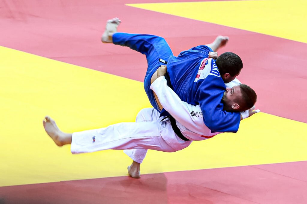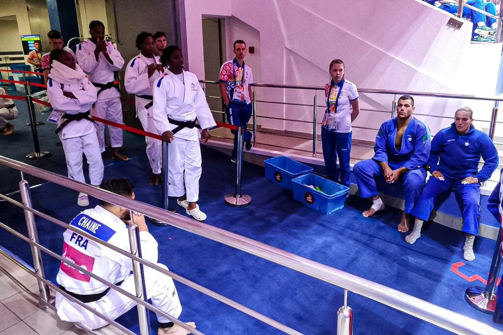 בניגוד ליום הקודם שראינו רק משקלים גדולים, הפעם קיבלנו רמה קצת יותר גבוהה וקרבות טובים. בג'ודו הקבוצתי יש קצב גבוה, קרב אחרי קרב, ויש הרבה דינמיקה בתוך כל נבחרת. ראינו חבר'ה של המשקל הפתוח מעל 110 קילו עושים מתיחות לנשים הקטנות של ה-57, הרבה חיבוקים קבוצתיים ועידוד מסיבי מהספסלים. החלטתי לנסות לבדוק אם אני יכולה להגיע לצד השני, כדי שבצילומים גם יהיה לי קהל ברקע. אז אחרי שהקפתי את האולם ולא מצאתי כניסה, פשוט עברתי דרך היציעים. לסדרנים (או שמא נאמר – מתנדבים עם ווסט שכתוב עליו 'אבטחה') לא ממש היה אכפת, הם רק מדי פעם עברו ואמרו לאנשים להוריד רגליים מהכיסאות. גם עשיתי גיחה קצרה לפרקט עצמו לצלם קצת מאחורי הקלעים.