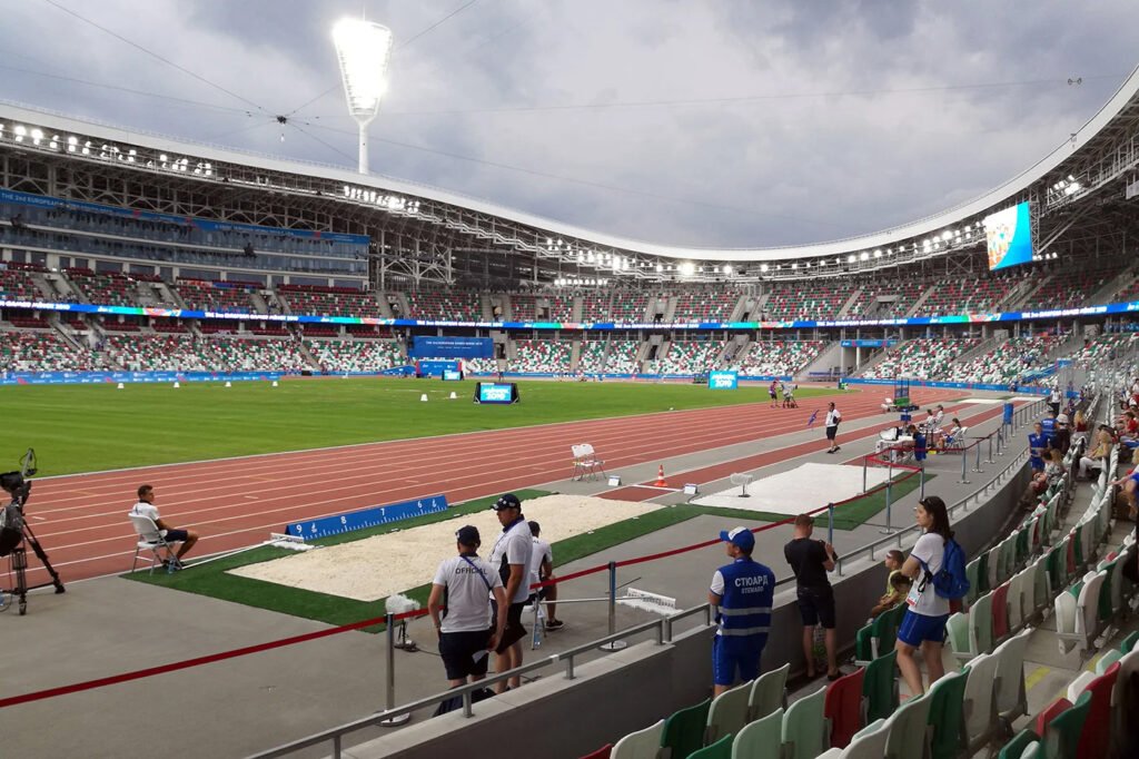התחנה הבאה שלנו לאותו יום הייתה באיצטדיון האתלטיקה הענקי דינמו מינסק. אני ואמא מאוד אוהבות אתלטיקה, היינו גם באליפות אירופה לנבחרות שהייתה בארץ וראינו הרבה בטלוויזיה. הזמנתי לנו כרטיסים לשני ערבים של אתלטיקה, כל פעם בצד אחר של האיצטדיון כדי שנוכל לראות דברים שונים. הפעם בבידוק הביטחוני הם גם פתחו את בקבוקי השתיה שאנשים הביאו והריחו, כנראה לבדוק אם זה אלכוהול. בתוך האיצטדיון הייתה אווירה נהדרת עם המון קהל והפעלות על המסך הראשי. המיקום שלנו היה בשורות הראשונות ממש קרוב לבור של הקפיצות, מה שניצלתי בהמשך כמובן לצילומים של חול מעופף, והיתה לי גם זווית טובה לריצות.