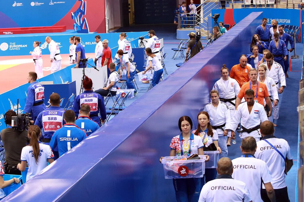 את היום השני במינסק התחלנו עם קפיצה לסופר להחליף כסף, ומשם עלינו על טרולי בס לאולם של הג'ודו. אחרי שסיימו עם המשקלים השונים, ביום האחרון נערכה התחרות הקבוצתית, קטגוריה שפעם ראשונה יוצא לנו לראות. בכל נבחרת יש 6 ג'ודוקא במשקלים שונים, 3 גברים ו-3 נשים, והנבחרת שמגיעה ל-4 נצחונות אישיים מנצחת. ומה קורה עם יש תיקו 3-3? אז המזכירות של התחרות עושה הגרלה שמשודרת על המסך הראשי, ואז יש קרב מכריע. גם הפעם אין כמעט צופים, פחות מ-1,000 איש, כמה עשרות רוסים ועוד איזה 200 בלארוסים מצויידים בדגלים. מה שכן יש את המשלחות שכל אחת מגיעה ליציע במיוחד לקרב של הנבחרת שלה ואנחנו יושבים ממש בתוכן. אז פעם אחת זה שורה של צרפתים ענקיים בכפכפים מעלינו ושורה של צרפתים ענקיים בכפכפים מתחתינו, ופעם אחרת זה לשמוע את הפולנים מתמרמרים על המשקל שעלה להם בהגרלה.