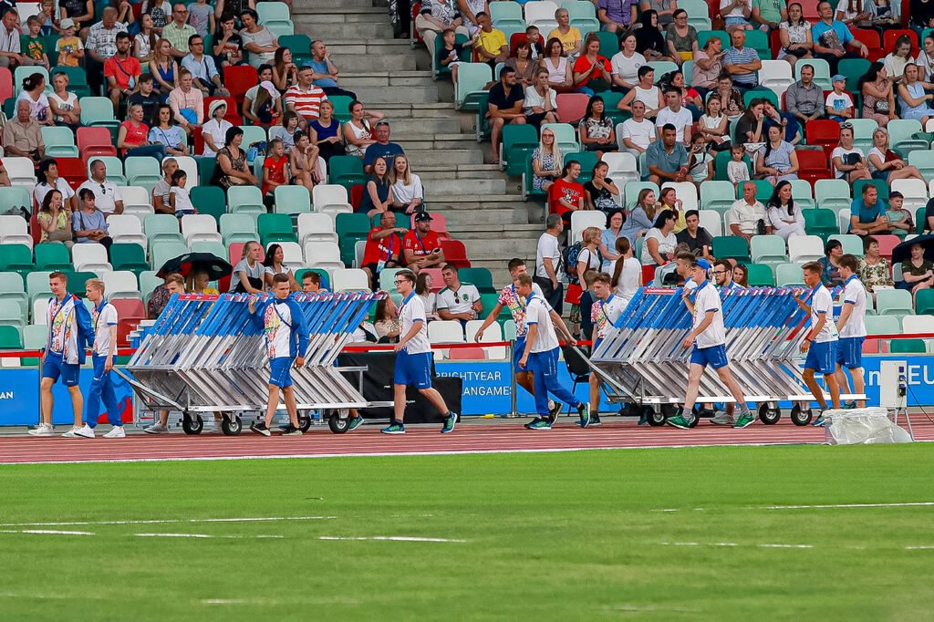 אנחנו הגענו לערב של חצאי הגמר, 12 נבחרות מחולקות לשני סשנים. 3 הראשונות מכל סשן יעפילו לגמר. לא חושבת שראינו רמה גבוה במיוחד, גם היה קצת קשה לעקוב אחרי המקצועות שהיו רחוקים מאיתנו שזה בערך הכל חוץ מהקפיצות. לפחות יצאתי עם כמה תמונות נחמדות. פתאום אחרי 3 ימים של שמש קיצית, עננים וגשם. למזלנו היה עלינו גג. בהמשך נגמר לנו המזל והגשם הגיע גם אלינו, ויחד עם כל שאר הצופים ניסינו לעלות למקומות מקורים. מזל שהבאנו מהארץ מטריות והשארנו אותן במלון. לקראת הסוף של הסשן הראשון כבר הבנו שמיצינו את עניין האתלטיקה, והחלטנו לחתוך. חשבנו בהתחלה על תחבורה ציבורית, אבל היה גשם חזק מאוד ולא רצינו להתחיל לחפש את התחנה, אז הלכנו למתנדבים לבקש שיעזרו לנו עם מונית. המתנדבים החמודים ניסו, אבל בגלל הגשם כנראה לא היה אפשר להשיג אחת כזאת. אבל הם לא ויתרו, וניסו למעלה מחצי שעה להשיג לנו אחת כזאת. באיזשהו שלב אחד המתנדבים גם יצא לרחוב לנסות למצוא לנו משהו (זוכרים שגשם חזק כן?). בנתיים נשארנו באוהל ודיברנו איתם קצת על כל מיני דברים. בסופו של דבר הצלחנו להשיג מונית, אותו מתנדב לקח אותנו למטה לרחוב כדי לעזור לנו למצוא אותה, הודנו לו מכל הלב וחזרנו קצת רטובות למלון בידיעה שסיימנו עם אתלטיקה במינסק.